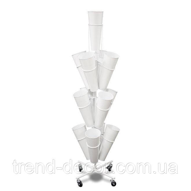 Підлогова металева підставка білого кольору під квіти з тринадцятьма кашпо. Діаметр кашпо 14,5 см., висота кашпо 34,5 см.