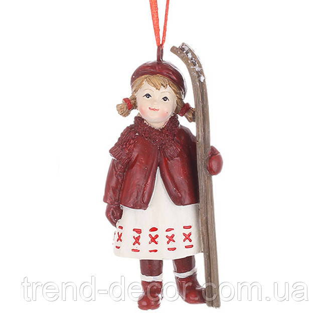 Новорічна декоративна підвіска Дівчинка з лижами, 9.5 см. Матеріал - полістоун.